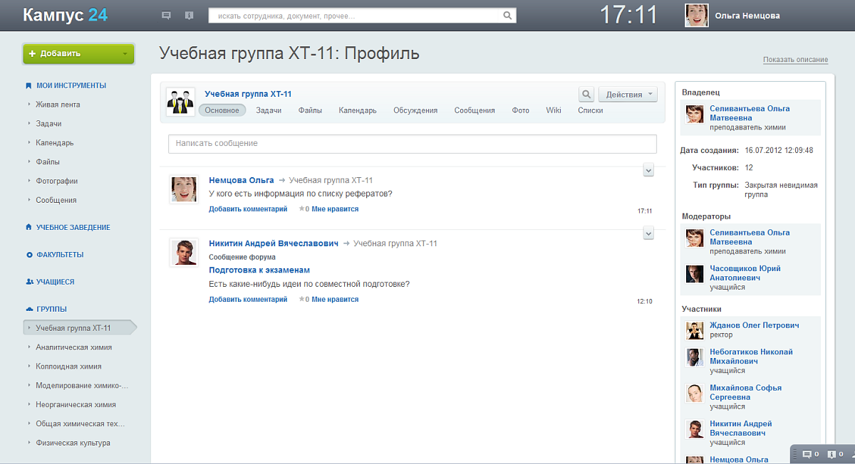 - Просмотреть свои учебные группы: списки учащихся и их контакты, старост, управлять группой (для кураторов);
