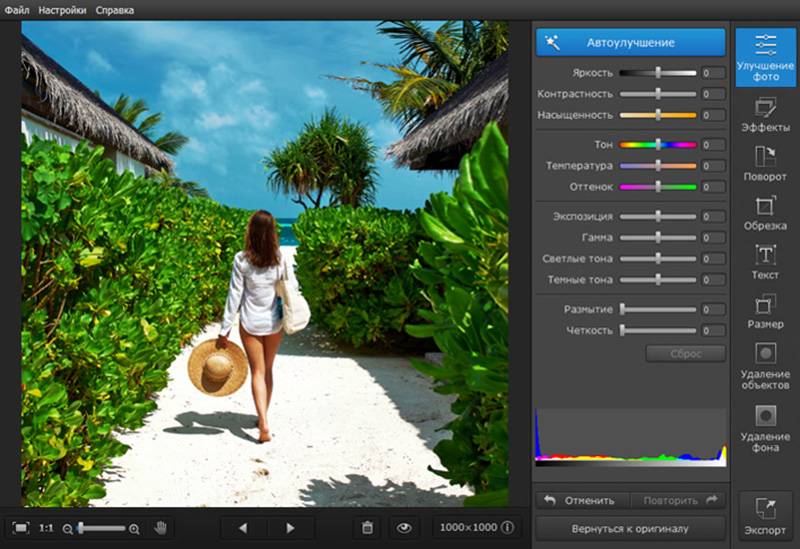 Movavi Фоторедактор – это графический редактор, который легко освоить, даже если вы никогда раньше не пробовали обрабатывать фотографии. Удобный интуитивный интерфейс позволит вам улучшать и исправлять фотографии без специальных знаний: стирайте случайно попавшие в кадр предметы одним кликом, регулируйте контраст, яркость и другие параметры автоматически и вручную, экспортируйте изображения во все популярные графические форматы.