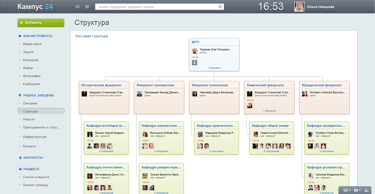 - Посмотреть структуру учебного заведения (факультеты/кафедры/администрация), информацию о ключевых персонах;